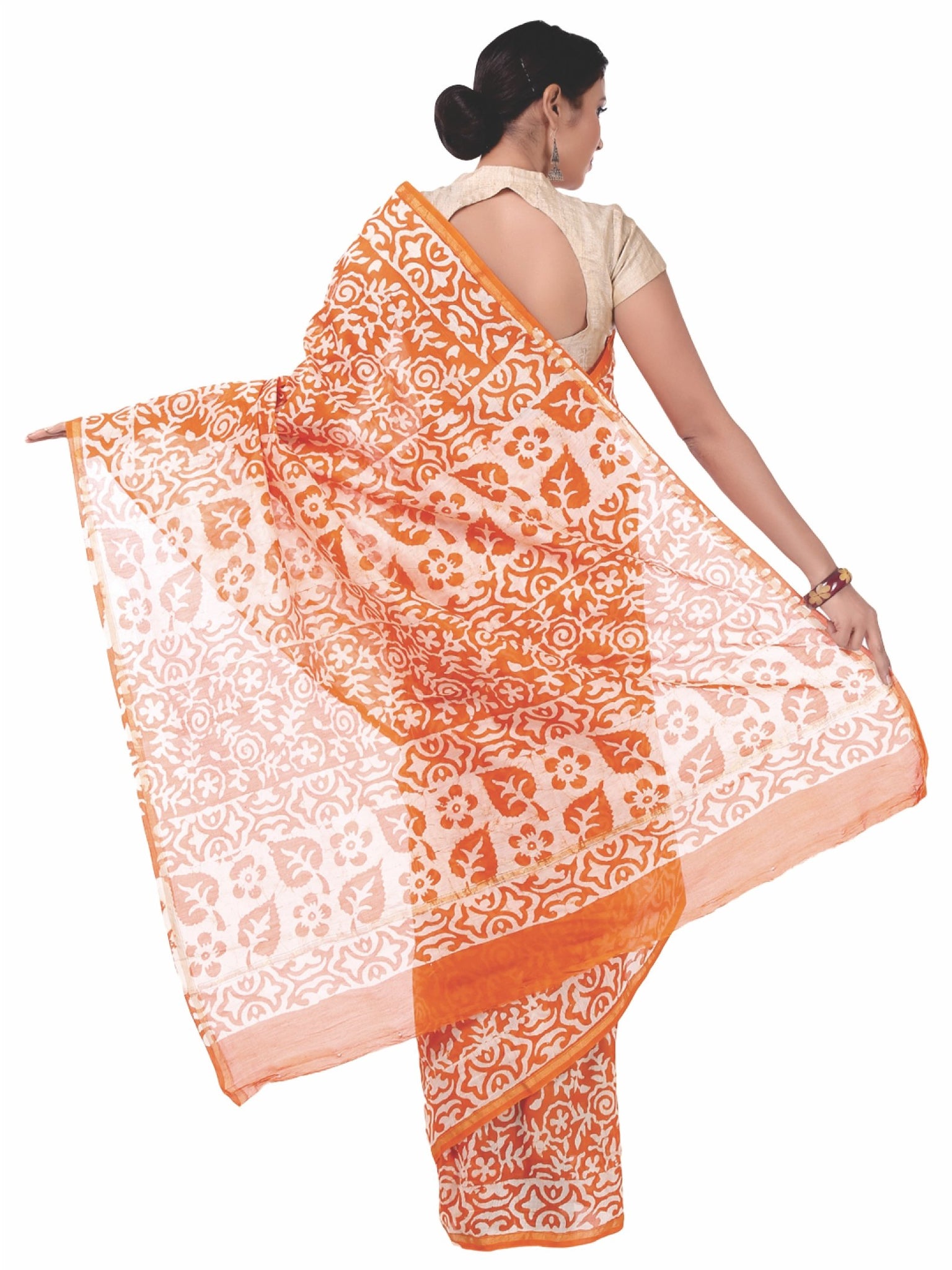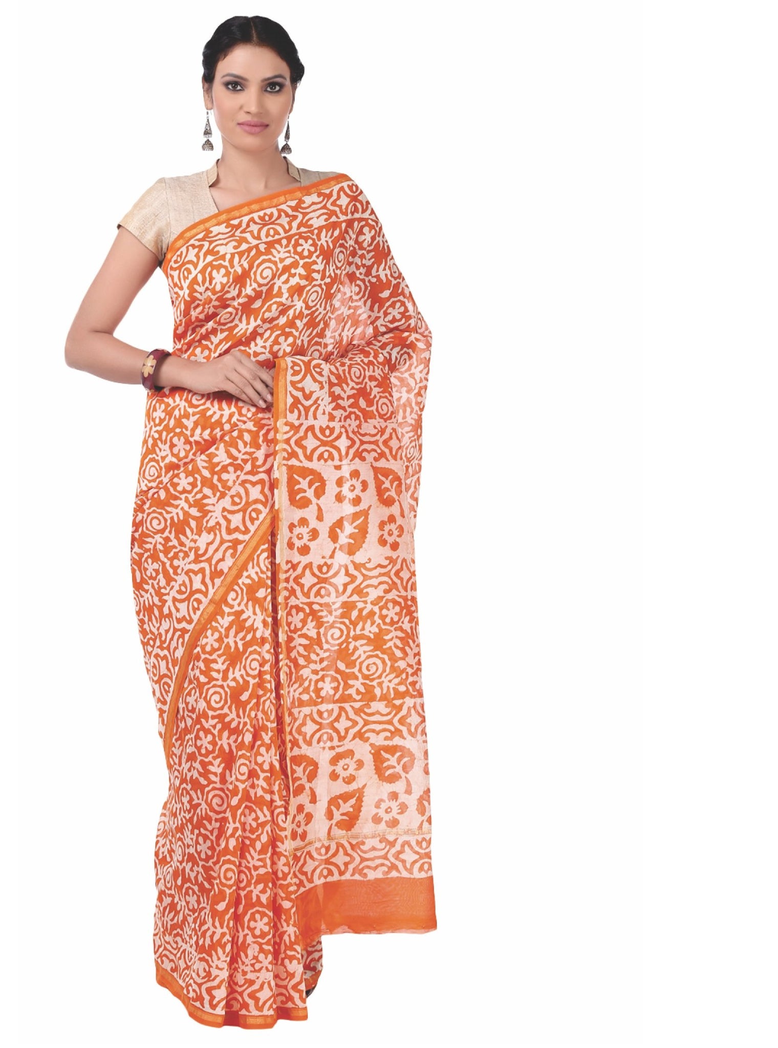 Orange Chanderi Silk Batik Hand Block Print Handcrafted Saree